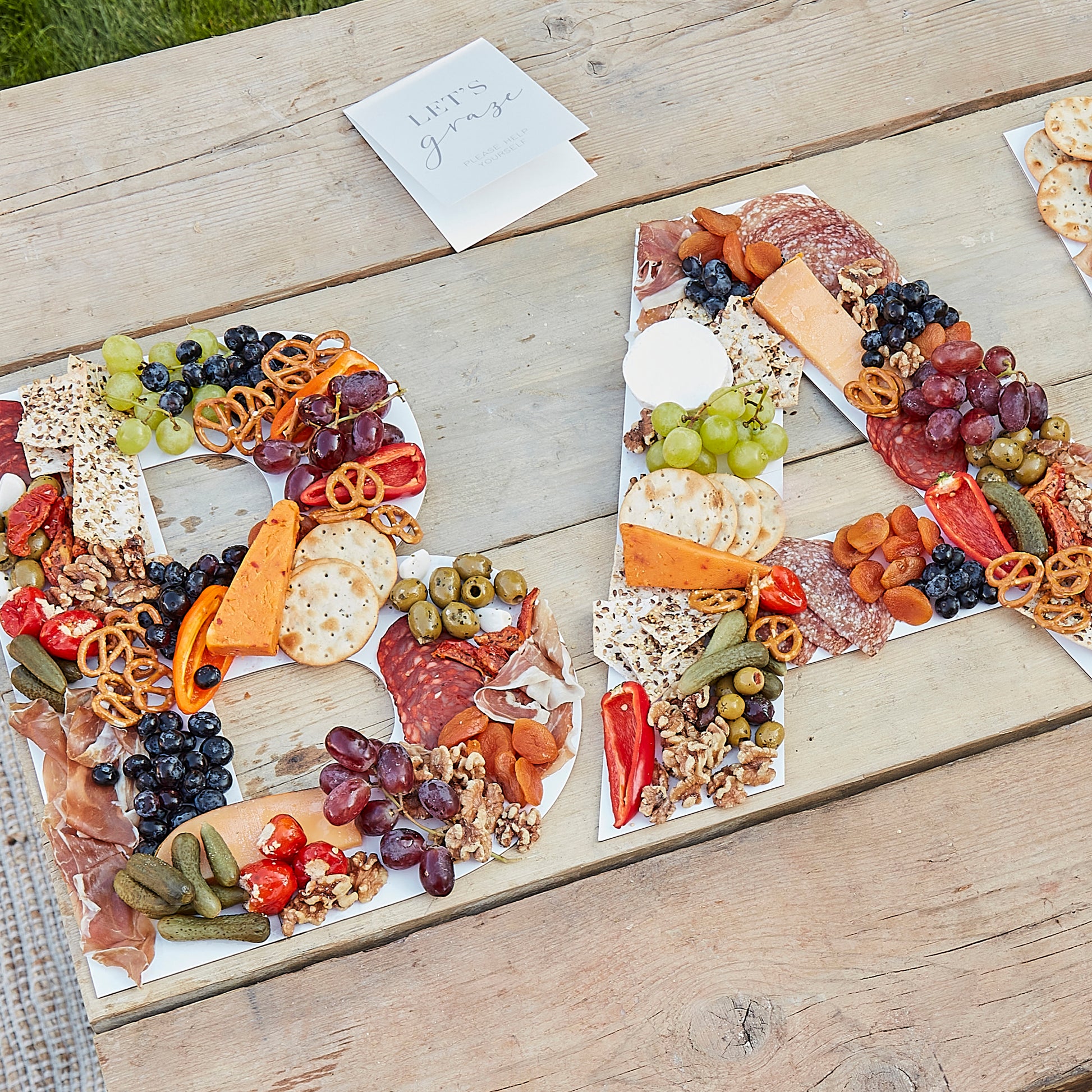 Beeindrucke die Gäste deiner Babyparty mit diesem stilvollen "Baby"-Buffetbrett. Das Buffetbrett wird mit 4 x Brettern mit dem Schriftzug "Baby" und einem "Let's Graze"-Zeltschild geliefert.