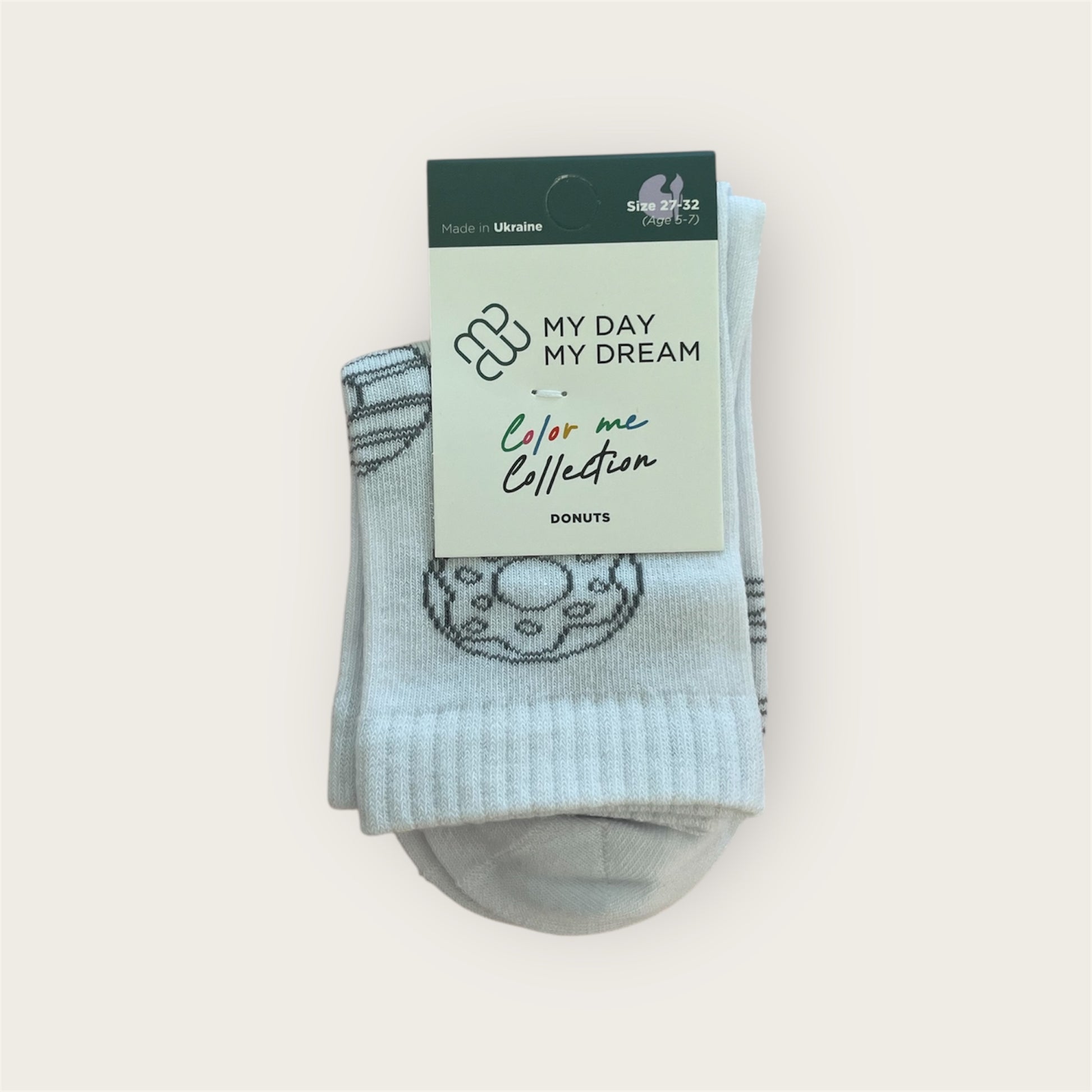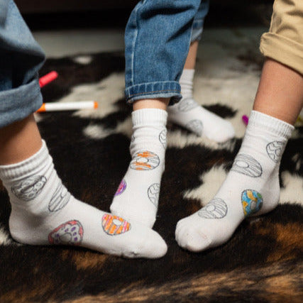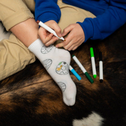 Unsere Color-Me-Socken mit verspieltem Donut-Design sind speziell für Kinder gemacht. So können die Kleinen ihre eigenen Socken kreativ gestalten und ihrer Fantasie freien Lauf lassen. Ohne Textilstifte!