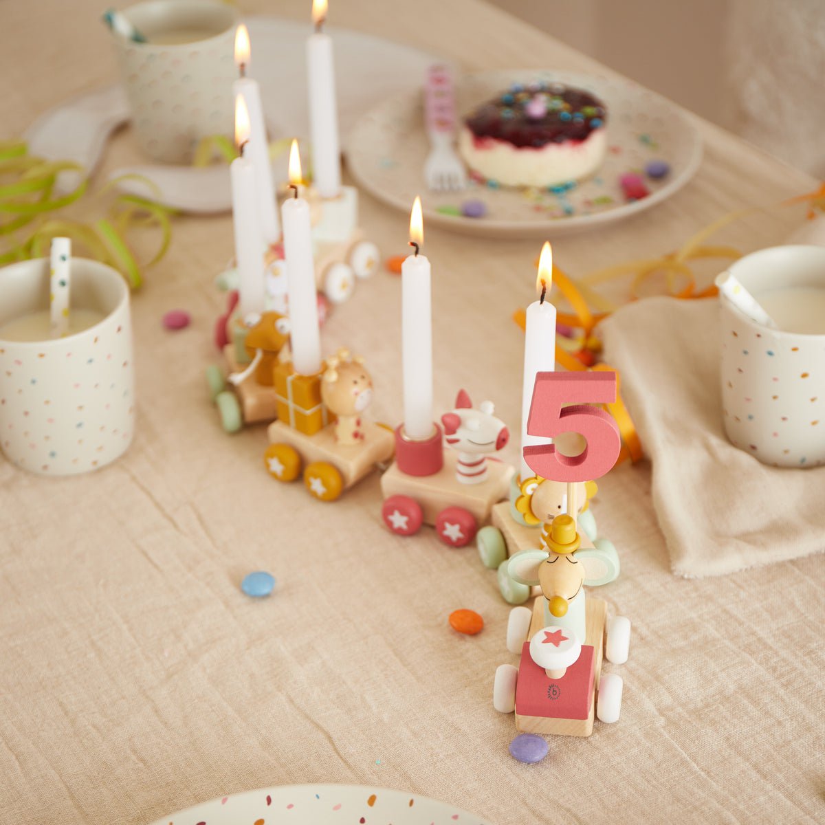 Der schöne Bieco Geburtstagszug Kinder ist die perfekte Ergänzung für jeden Geburtstagstisch. Der 27-teilige Kerzen Geburtstagszug besteht aus einer Lok und 6 Anhängern in niedlicher Tierform.