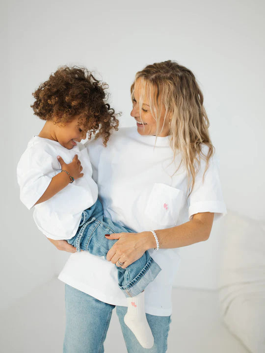 Entdecke unsere extra weichen Herz-Socken für Kinder, perfekt für den idealen Mutter Tochter Partnerlook, Vater Sohn Partnerlook oder die ganze Familie. Mit unserem kleinen pinken Herz-Logo am Knöchel eingestickt, passen diese süßen Socken perfekt zu allen Partnerlook-Styles aus unserer Collection. Die gerippten Partnerlook Socken bieten eine softe, verstärkte Sohle mit gewebtem rosa "AR" unter dem Fuß.