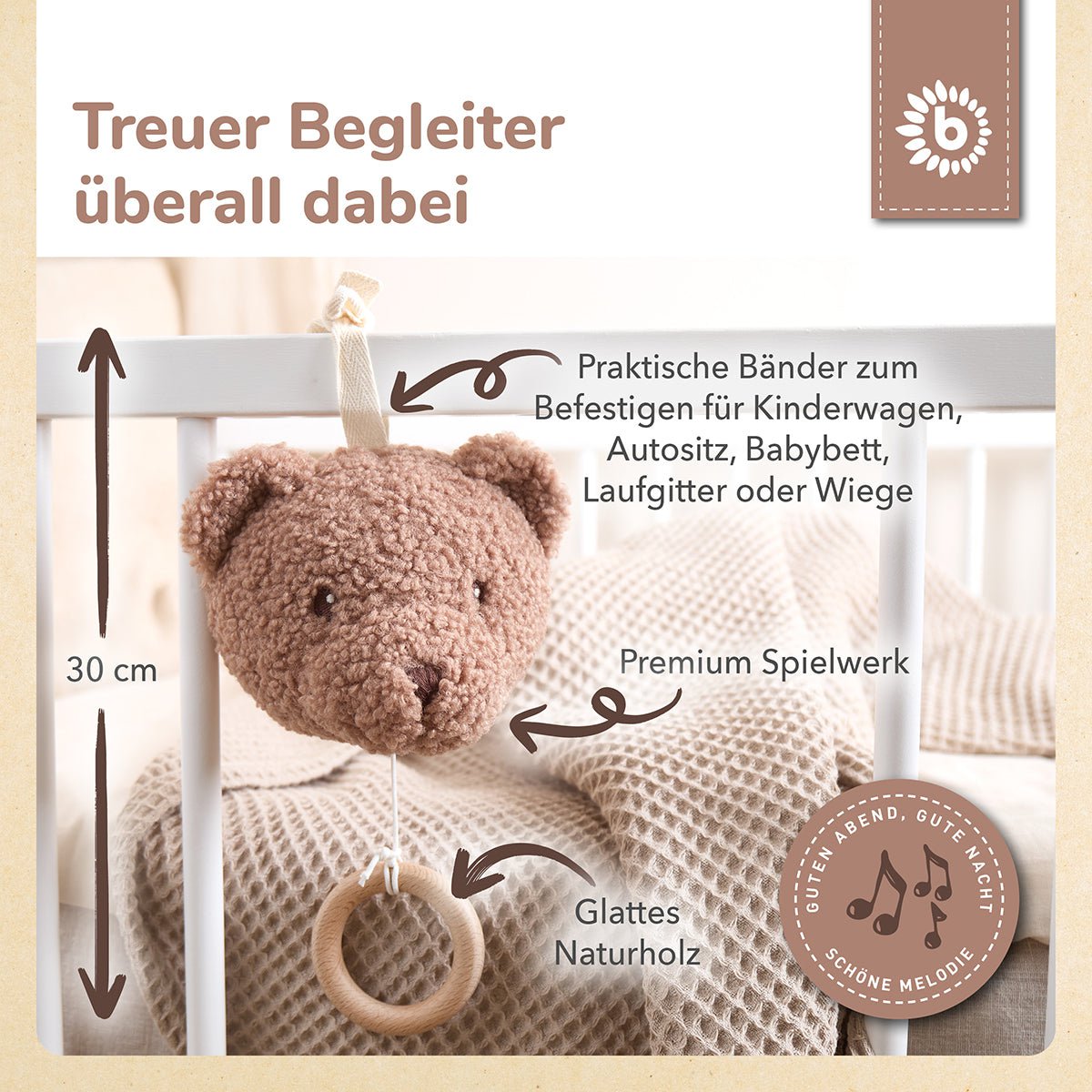 Mehr als nur eine Baby Einschlafhilfe. Der knuffige Bär Mika spielt die wundervolle Melodie von Brahms Wiegenlied, auch bekannt als „Guten Abend, gut' Nacht“. Er ist außerdem super flauschig und ist damit nicht nur zum Hören, sondern auch zum Drücken, Greifen und Tasten. Dein Baby wird den Bären lieben!