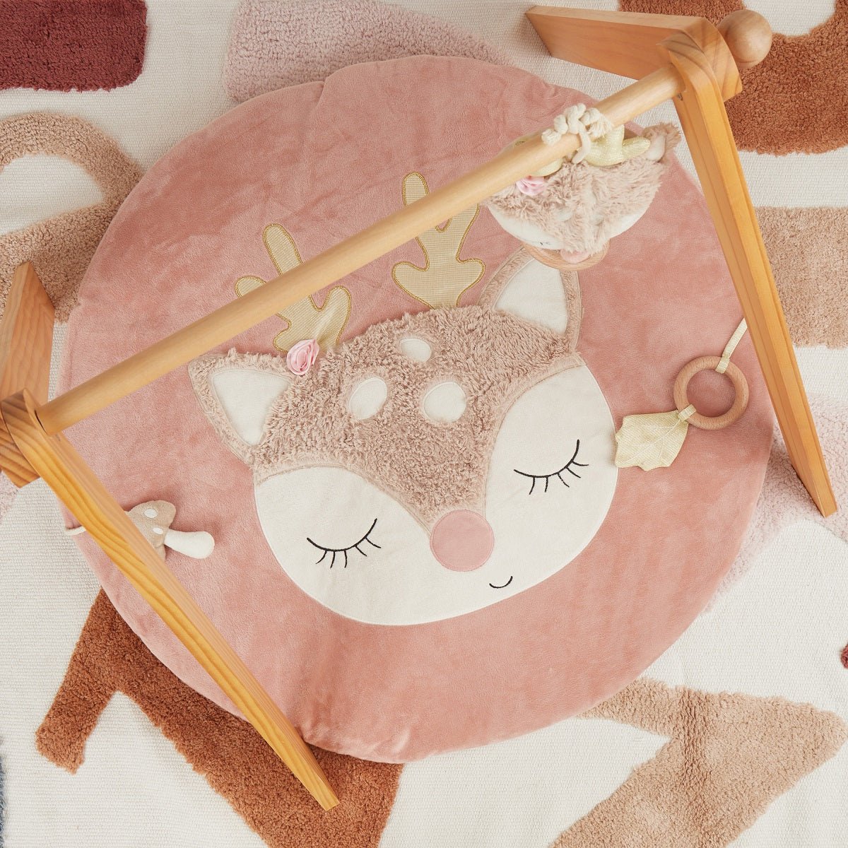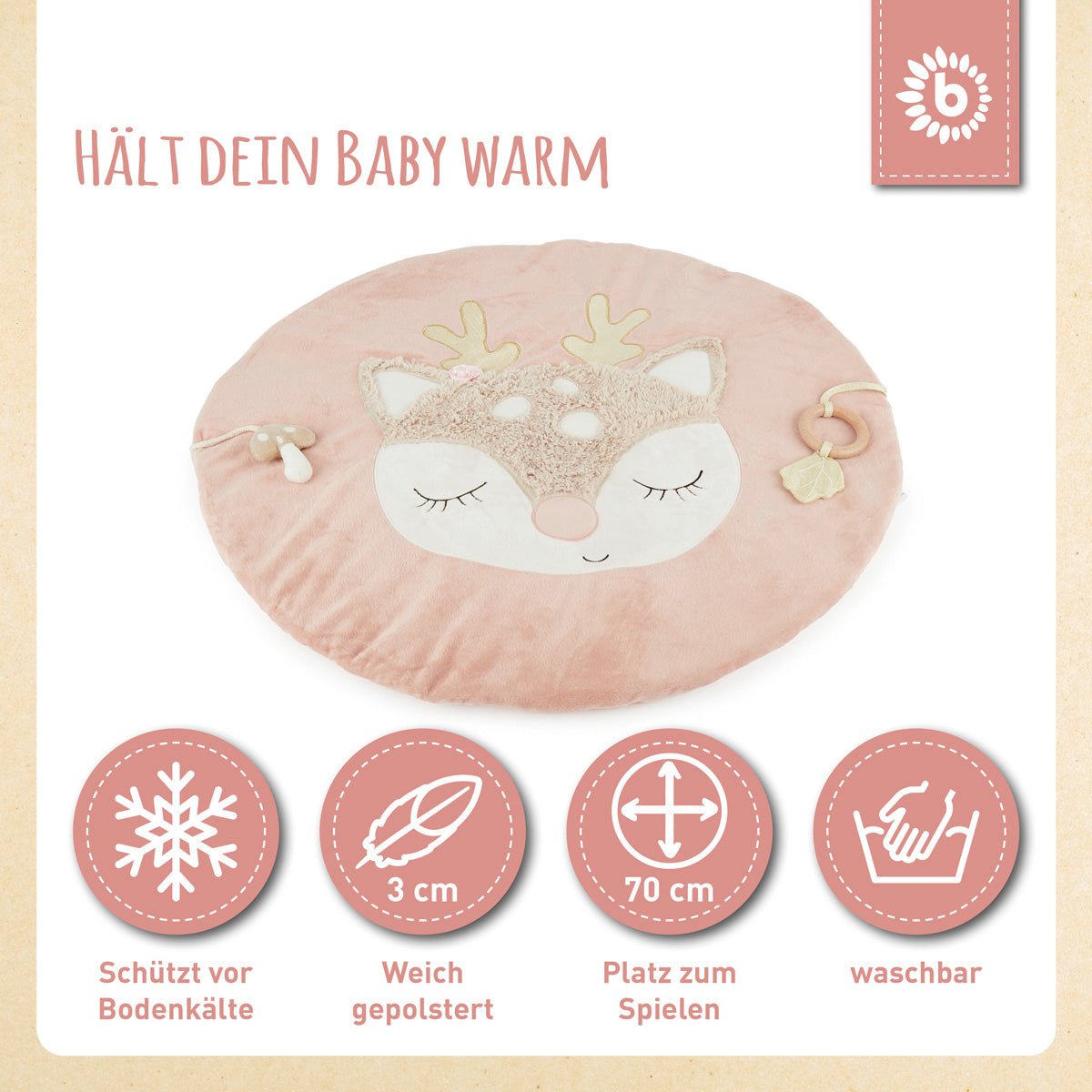 Schöne und moderne Krabbeldecke für dein Baby aus Plüsch. Auf dem Kissen ist mittig ein niedlicher Reh Kopf gestickt, welcher haptisch unterschiedliche Strukturen für Dein Baby bereithält. Außerdem sind links und rechts von an der Decke kleine Spielelemente mit einem Band befestigt.