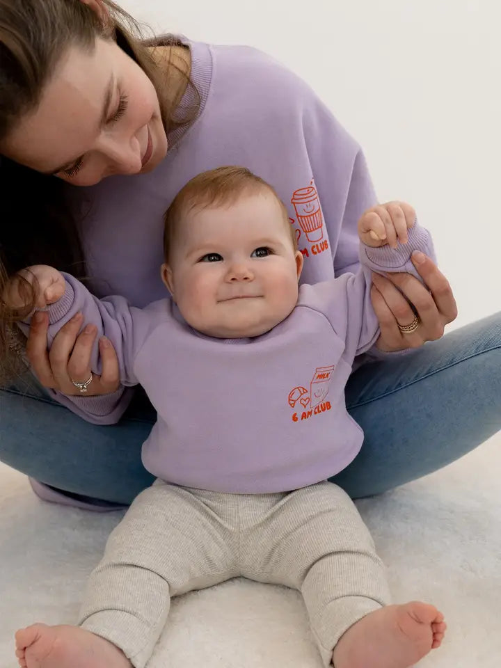 Willkommen im 6am Club - Vorne ziert ein süßer Print mit Milchtüte, Croissant und Herzchen das Design, darunter das Statement „6AM Club“ in orange.